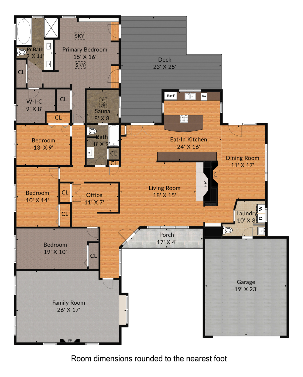 Step inside to discover vaulted ceilings, a designer color palette, and custom concrete kitchen counters that create a warm and inviting atmosphere. The spacious family room, complete with a gas fireplace, is perfect for gatherings, while the primary suite provides a tranquil retreat, enhanced by skylights, dual sinks, dual shower, and a spa like jetted tub. An additional office space makes working from home effortless, and the secondary bathroom includes space for an indoor sauna.